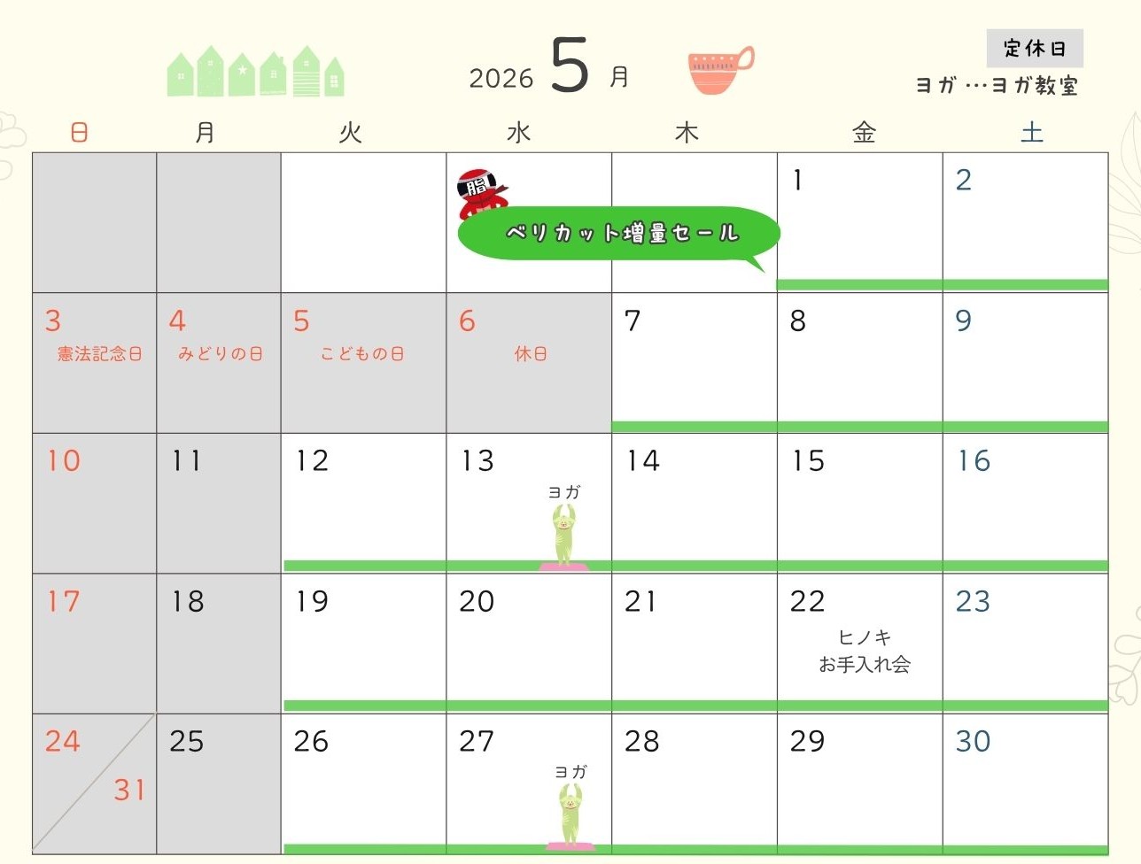 当店ではヨガ教室を主催しております。ダイエットをスタートされた方など、お店のお客様でしたらどなたでも無料体験できます。リバウンド防止の一つの手段として通われている方も多いです。